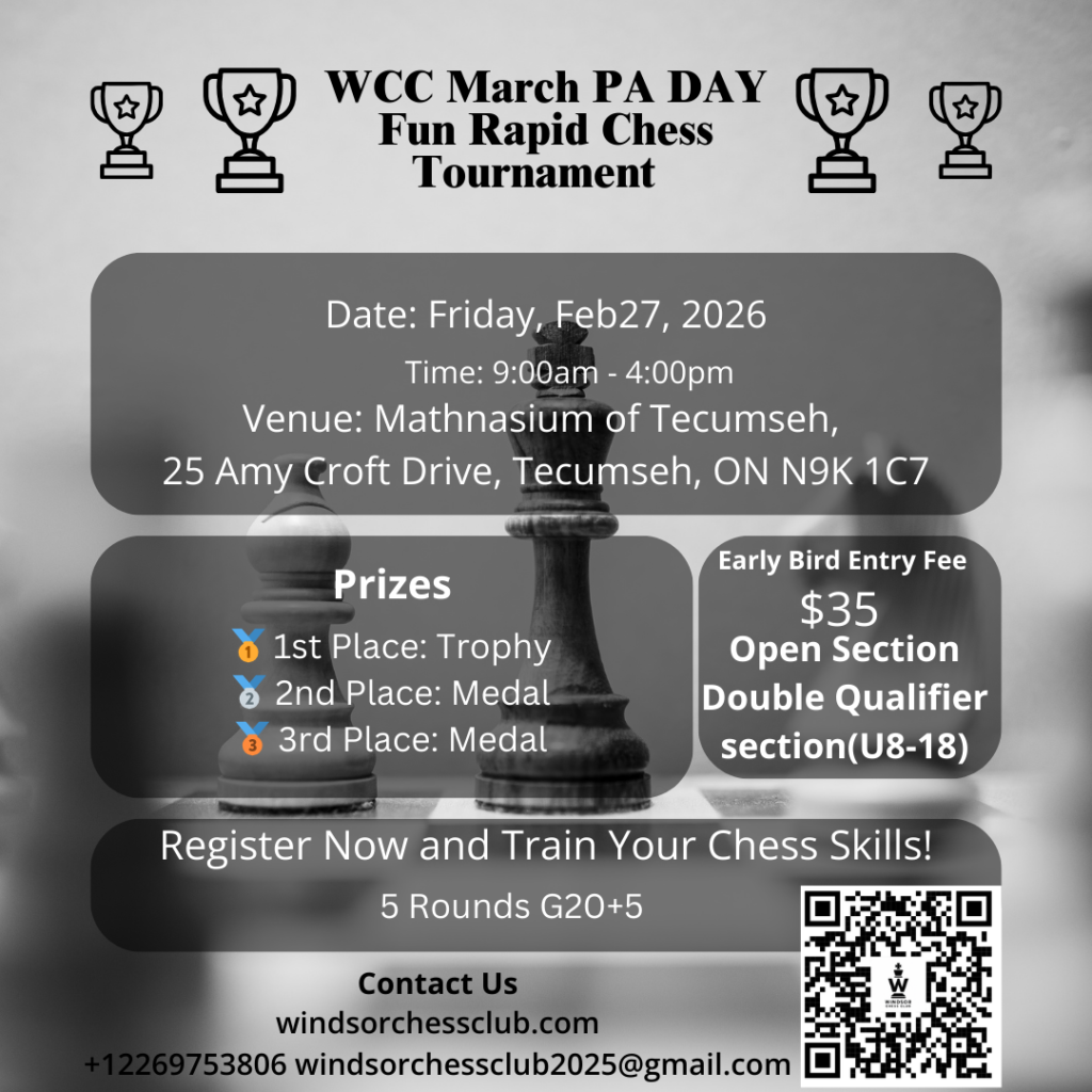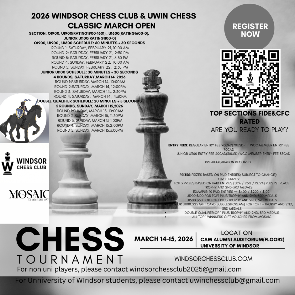 Please pay the entry fee via email transfer at windsorchessclub2025@gmail.com (Please include Player Name, CFC ID and Section)or pay Cash on site.
